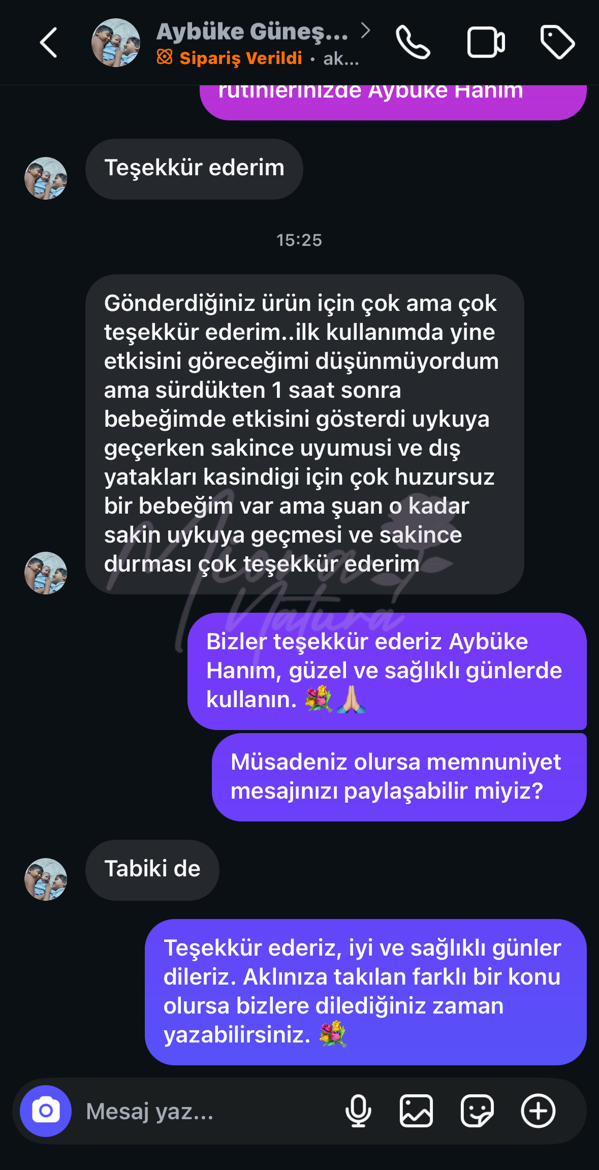 “ Bu ürünü çok seviyorum, içeriğine de bayıldım. Kızım ne zaman kullansam huzurlu bir uyku çekiyor. ” -