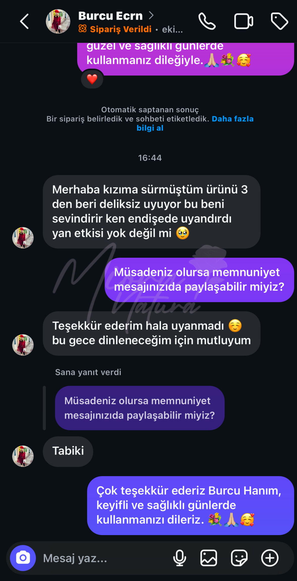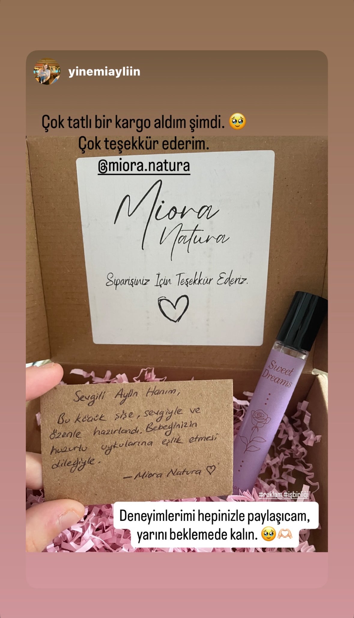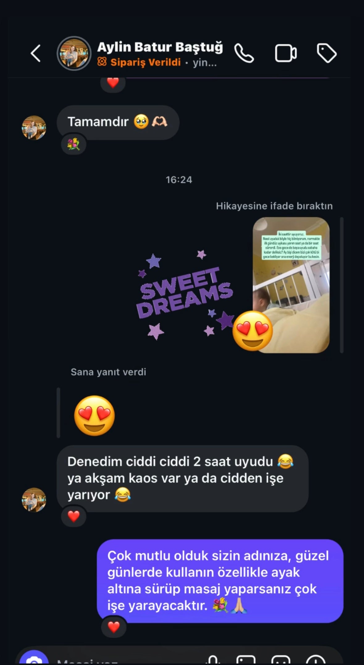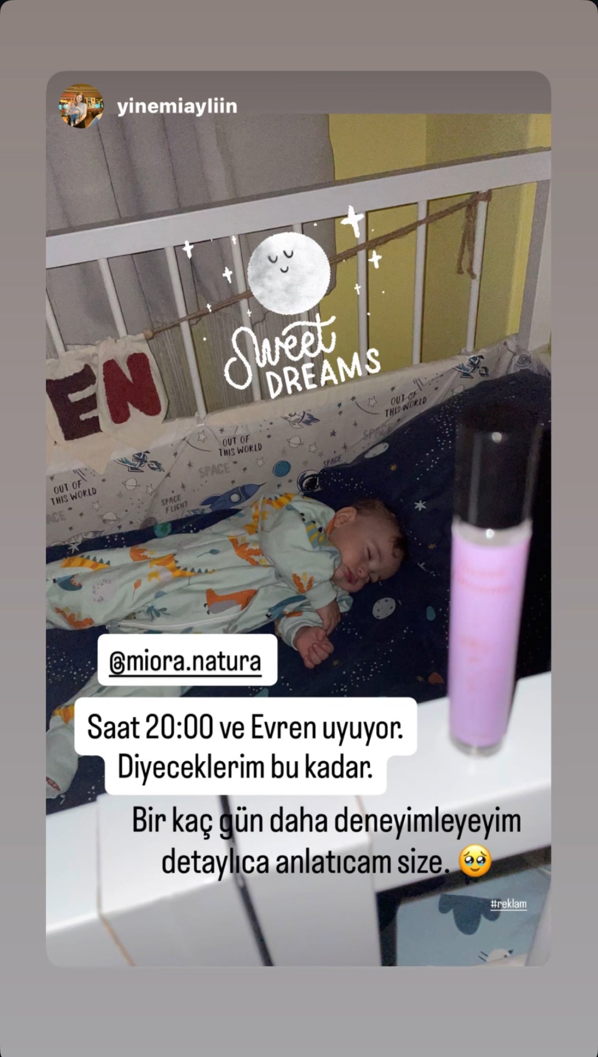 “Sweet dreams benide uyutuyor artık! Bebeğim artık gece çok kalkmıyor. Ürünü kullanmaya başladıktan sonra markanın bana gönderdiği e-kitabı da okudum, orada verilen küçük uyku rutinleri ipuçları sayesinde etkisi kat kat arttı. Hem doğal içerikli bir ürün hem de annelere yol gösteren bilgiler sunmaları beni çok etkiledi. Markanızı çok sevdim biticek gibi değil ama biterse tekrar sipariş vericem muhtemelen 💐.”