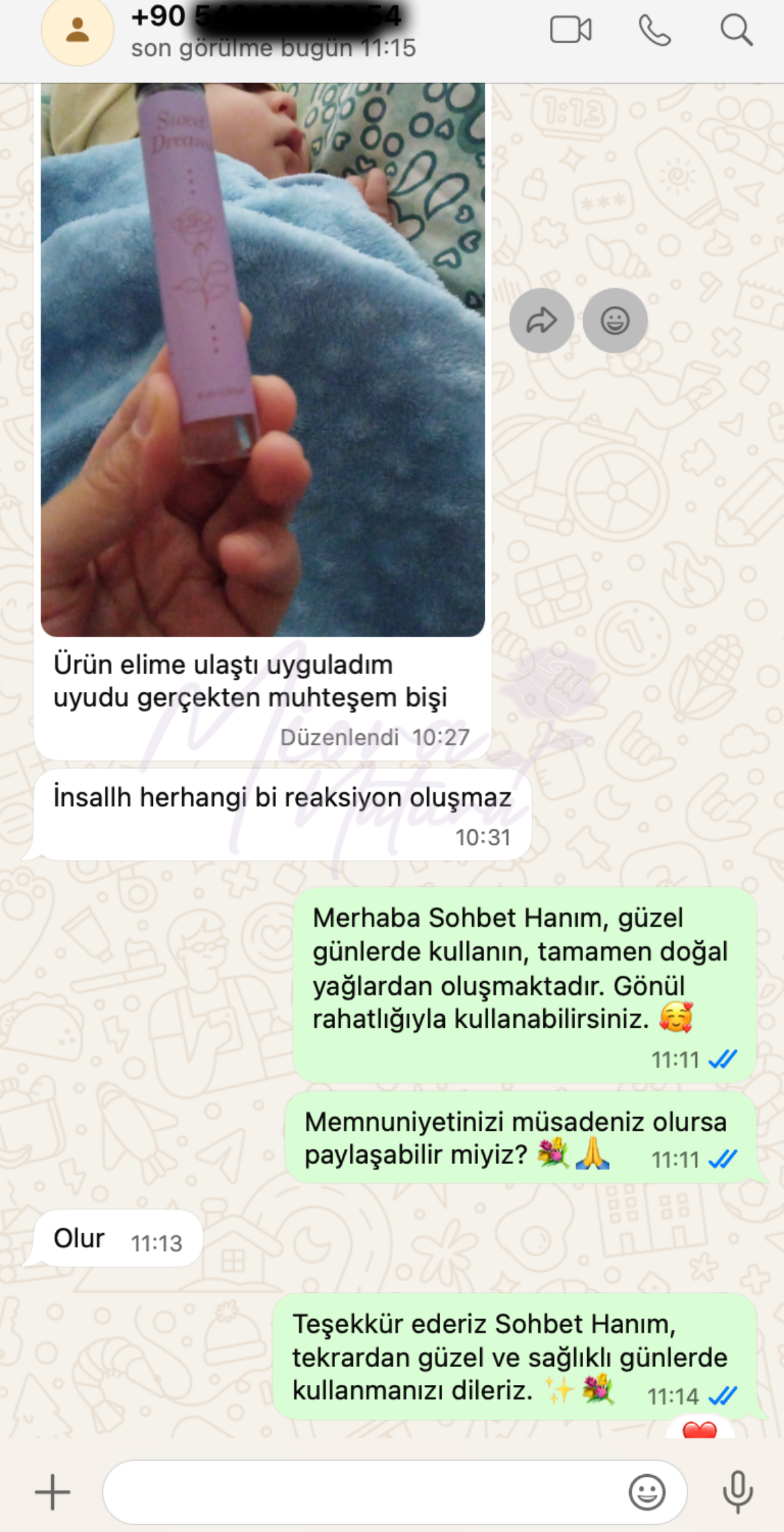 “Oğlum geceleri sürekli uyanıyordu, bazen her saat başı! İnstagramda Sweet Dreams Roller’ı gördüm denemek istedim ve düzenli kullanmaya başladıktan sonra artık Merih Ege kesintisiz uyumaya başladı :). Hem kokusu çok hoş hem de tamamen doğal olması beni çok rahatlattı. 2'li aldım kız kardeşimde yeğenim için denedi ondada benzer sonuç aldık, teşekkür ederiz vallahi 🥰.”